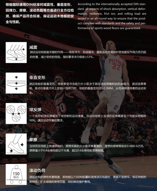 人在运动时形成的冲量作用到运动木地板平面会产生振动,体育运动木地板的结构必须具备震动吸收功能,即运动员起跳回落到运动木地板时,必须有53%以上的冲量被运动木地板吸收掉,从而起到保护人的踝关节、半月板、脊椎、大脑的作用,使人在运动时不致受到伤害。其保护功能也考虑了一个人在运动木地板上运动时不能影响相邻人员。这也是DIN标准中所阐述的震动吸收、震动变形与延伸变形的功能。